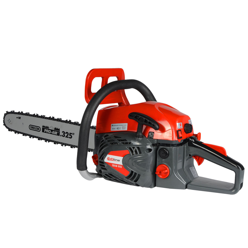 Бензиновая цепная пила EVOline CSG 50-18 ES характеризуется мощностью в 2,7 л.с. и оснащена надежным 2-тактный двигателем (49,8 куб.см) последнего поколения. В комплект CSG 50-18ES входят шина 18 дюймов (46 см) и пильная цепь от американской компании OREGON, чехол для пильной шины, набор инструментов в фирменном чехле и комбинированная канистра для топливной смеси.