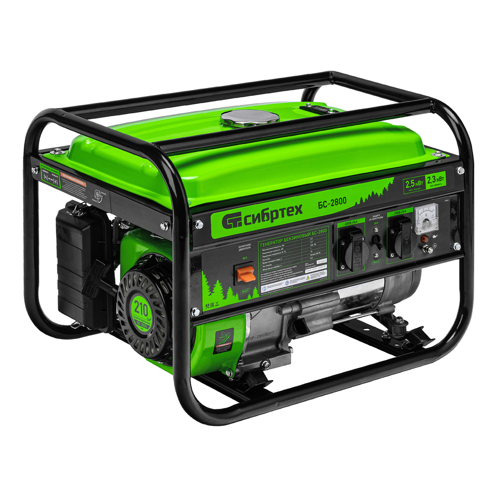 Бензиновый генератор Сибртех БС-2800 94543 на 230 В, максимальной мощностью 2,5 кВт, с 4-тактным двигателем и баком объемом 15 л, подходит для использования на даче, в гараже, мастерской или на стройке. Небольшой вес 37,6 кг позволяет брать генератор с собой на выездные работы или на природу. Мощности 2,5 кВт достаточно для одновременного питания 2 ламп накаливания, холодильника, СВЧ-печи и телевизора. 2 розетки упрощают одновременное подключение нескольких приборов.
