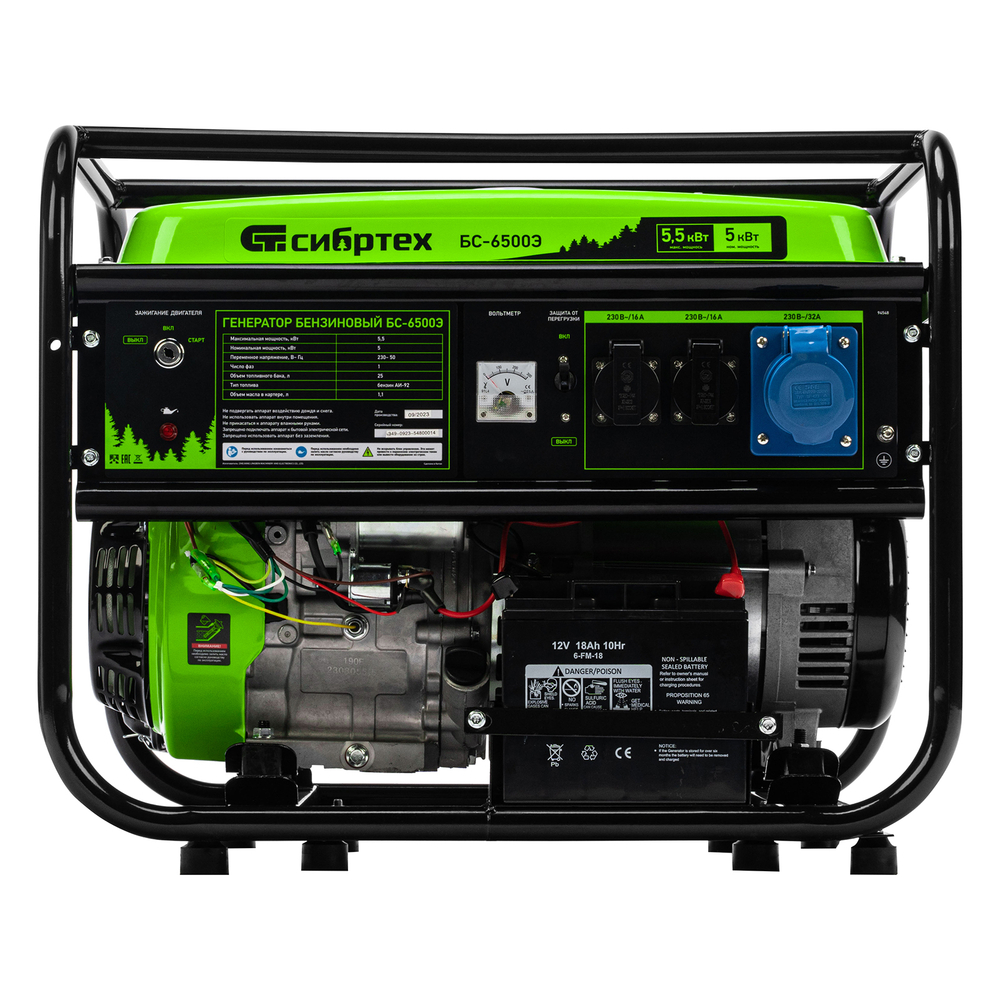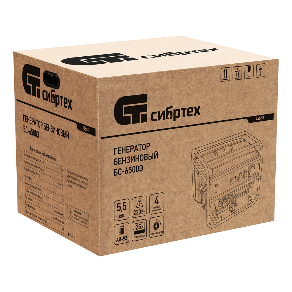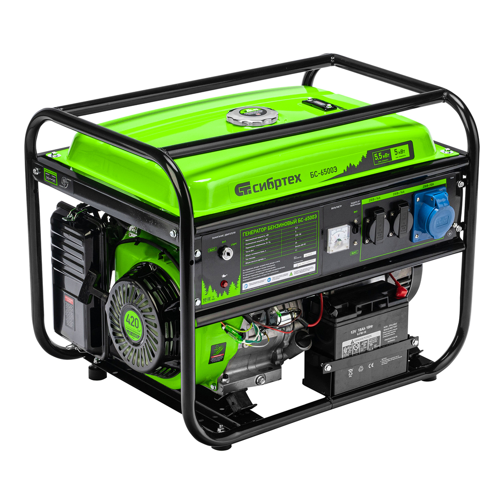 Бензиновый генератор Сибртех БС-6500Э 94548 максимальной мощностью 5,5 кВт, с 4-тактным двигателем, электростартером и баком объемом 25 л, выдает напряжение 230 В и используется для электроснабжения на даче, на строительной площадке, в магазине, в мастерской или гараже. Мощности хватает для обеспечения работы электроинструмента или одновременного подключения 4 ламп накаливания, телевизора, плиты и холодильника. Благодаря электростартеру запуск генератора осуществляется одним поворотом ключа.