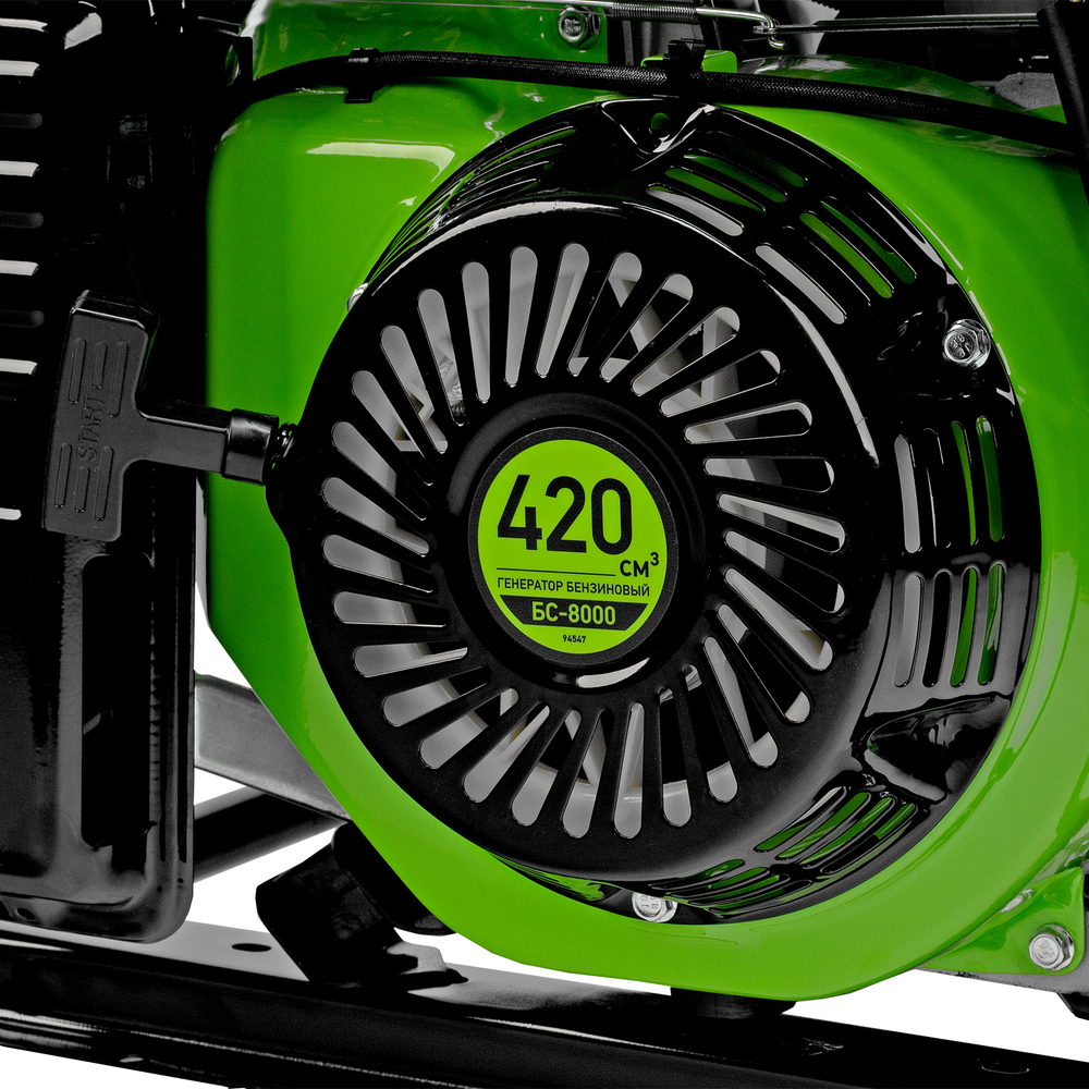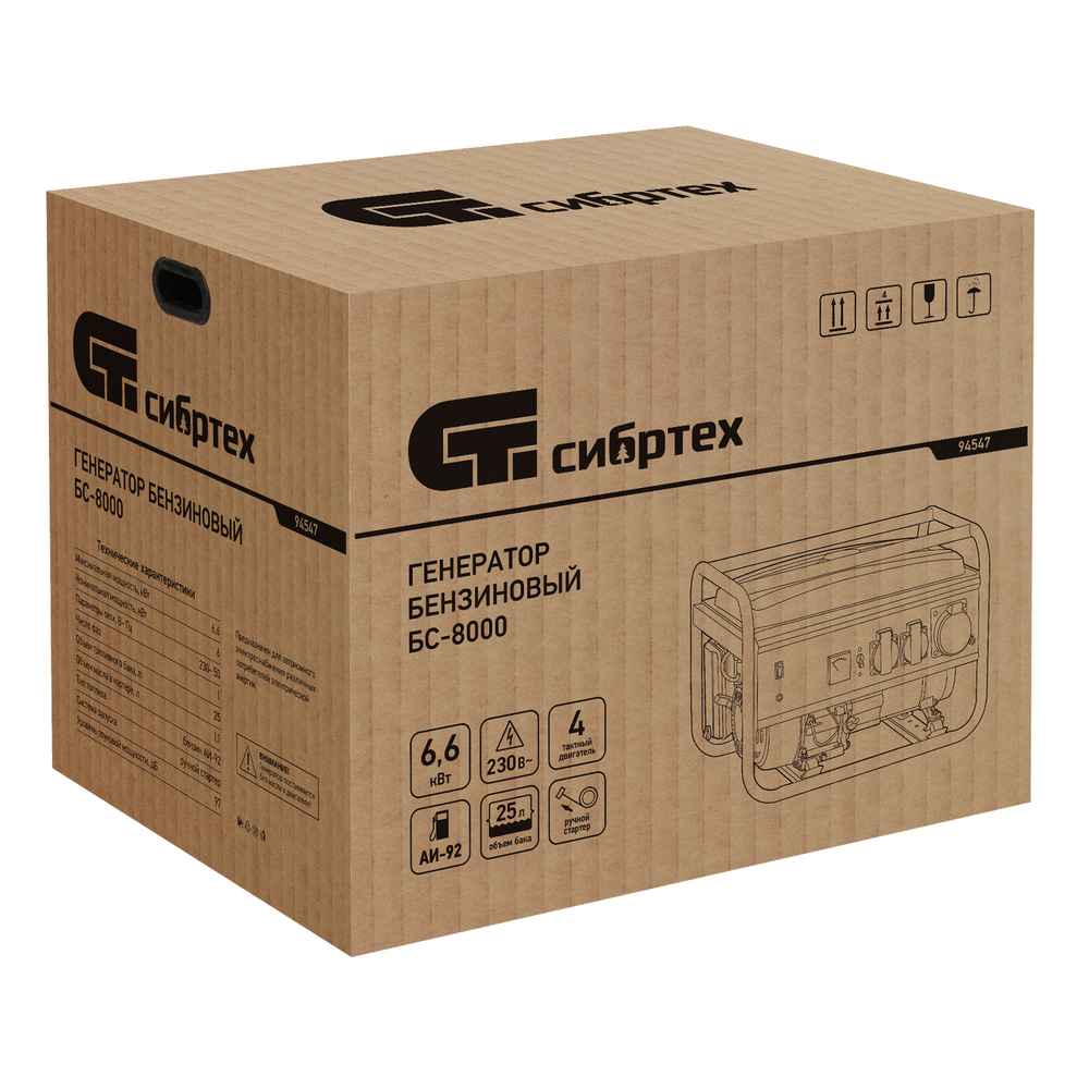 Бензиновый генератор Сибртех БС-8000 94547 на 230 В, с 4-тактным двигателем, с ручным стартером и баком объемом 25 л, вырабатывает 6,6 кВт и отлично подойдет для дачи, стройки, торговой палатки, гаража или мастерской. Высокая мощность и наличие силовой розетки позволяют одновременно подключить мощный водяной насос, электроплиту, а также обеспечить освещение рабочего места.