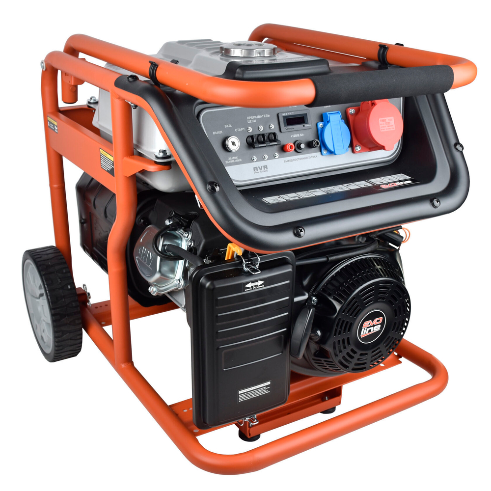 Электрогенератор EVOline KB 9003 E – бензиновый трехфазный (3 фазный) генератор с максимальной мощностью 8,5 кВА. Силовым агрегатом данной модели является четырехтактный двигатель ZONGSHEN GB 460 E. Генератор оснащен электрическим запуском. Рама выполнена из высококачественной стали, которая служит не только для защиты двигателя, но и для удобной транспортировки электростанции. Объем топливного бака составляет 32 литра, что дает примерно 11 часов непрерывной работы в зависимости от нагрузки. Уровень шума при работе генератора составляет 76,5 дБ. Данная модель идеально подходит как для дома, так и для малого или среднего бизнеса. Оснащена транспортировочным комплектом с колесами, счетчиком мото-часов, электростартером и 2-мя розетками, имеет размер (700х530х590 мм) и вес (100 кг). Гарантия составляет 2 года.