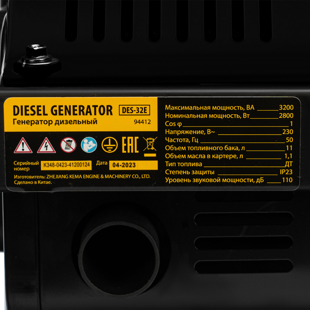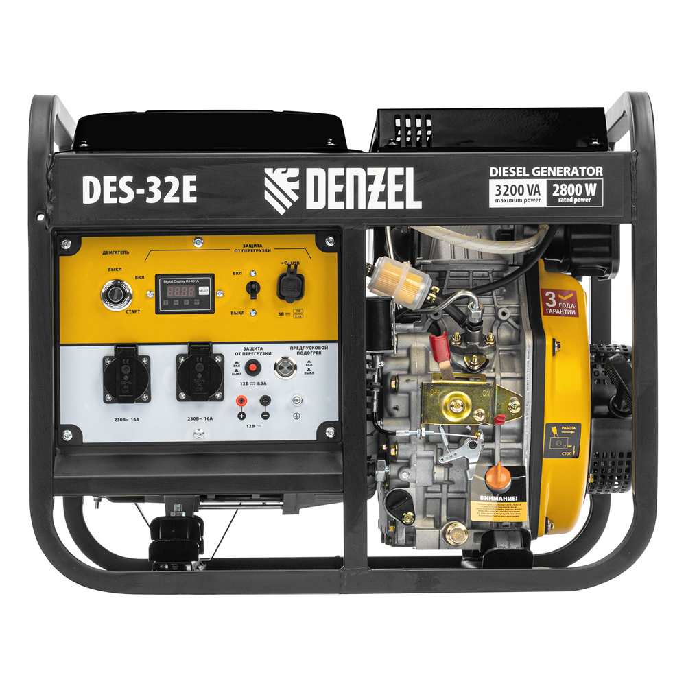 Генератор дизельный Denzel DES-32E 94412 с объемом топливного бака 11 л, с электростартером, имеет максимальную выходную мощность 3,2 кВт и поддерживает напряжение в сети 230 В. Используется для снабжения энергией потребителей однофазного тока (осветительных приборов, бытовой техники, электроинструмента) при отсутствии доступа к стационарному источнику питания. Для подключения электроприборов служат 2 розетки 230 В/16 А. Клеммы постоянного тока 12 В позволяют заряжать автомобильные аккумуляторы, а двойной выход USB 5 В предназначен для подключения мобильных устройств (планшетов, смартфонов и т. д.). Генератор пригодится в загородном доме.