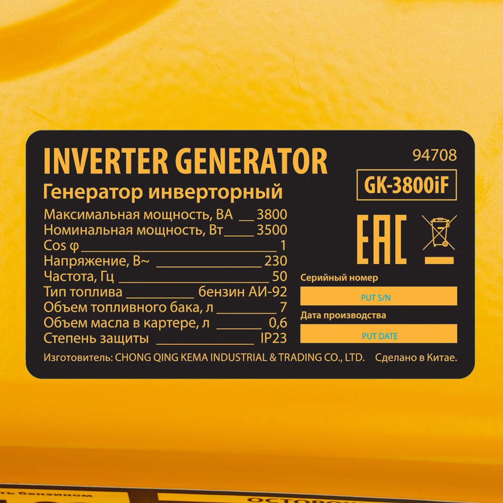 Инверторный генератор Denzel GK-3800iF 94708 максимальной мощностью 3,8 кВт, с ручным стартом, поддерживает напряжение 230 В и предназначен для питания осветительных приборов, бытовой техники, электроинструмента и т.д. в условиях отсутствия электросети или перебоев в ее работе. Обеспечивает подачу стабильного тока, подходит для подключения потребителей, чувствительных к качеству электроэнергии: газовых котлов, серверных станций, цифровой техники. Предусмотрена возможность подключения мобильных устройств к выходу USB 5 В. Клеммы постоянного тока 12 В можно использовать для зарядки автомобильных аккумуляторов. Генератор незаменим на дачном участке.