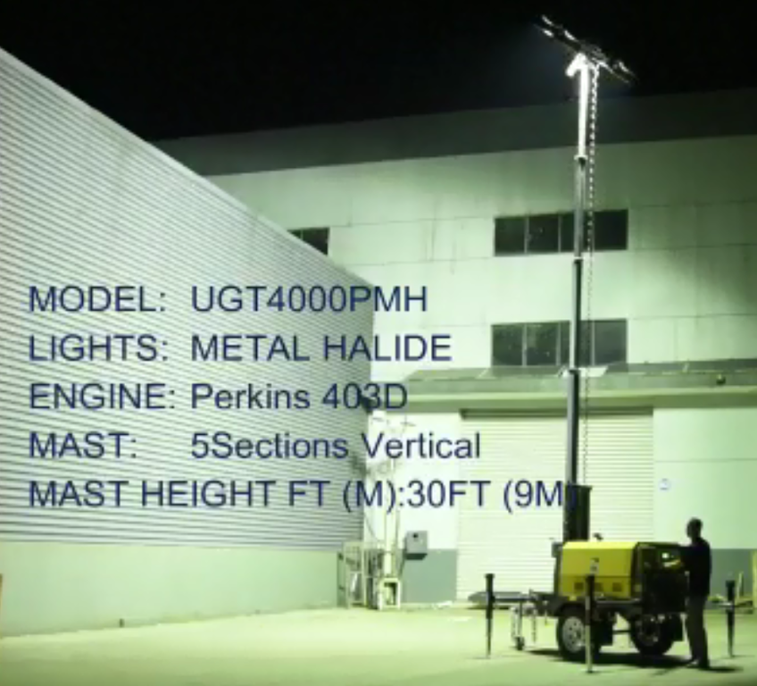 Основные параметры вышки LT41000Q Тип прожекторов - MH / Металлогалоген; Максимальная высота мачты - 9 метров Мощность каждого прожектора - 1000 Вт Количество прожекторов - 4 штуки IP уровень защиты - IP65 Площадь освещения - 4200 кв.м. Марка двигателя - Perkins Метод поднятия мачты - ручной при помощи лебёдки Максимальная скорость ветра - 80 км/ч Уровень шума - 62 Дб Аккумулятор - Varta 60 A/ч Объём бака с топливом - 45 литра Размеры и вес Размеры для перевозки транспортом - 3031 * 1488 * 2575 мм Размеры в рабочем положении - 3031 * 2600 * 9000 мм Вес - 1280 кг