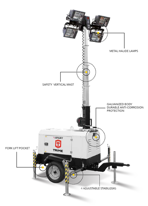 Основные параметры Высота мачты - 8,5 м.; Лампы металлогалогенные - 4х1000 Вт 360 000 люмен; Площадь освещения - 4200 м2 при 86 люкс, 36000 м2 при 10 люкс; Двигатель - дизельный Kubota D1105 Страна изготовления - Италия