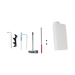 В комплекте поставки - емкость для смешивания топливной смеси, напильник для заточки цепи, необходимый для обслуживания набор инструмента.