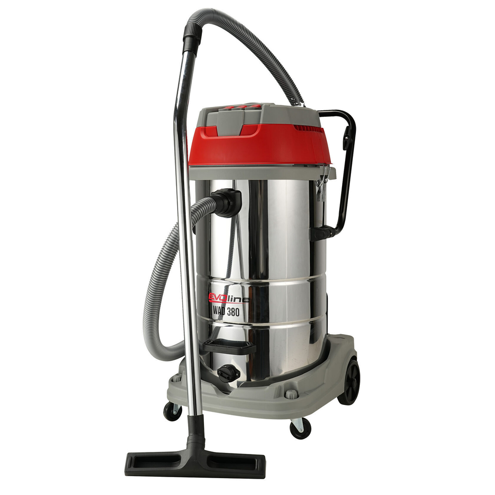 Электрический пылеводосос EVOline WAD 380 оборудован тремя мощными турбинами с раздельным включением. Пылеводосос предназначен для коммерческого и промышленного использования и отлично подходит для сбора сухой и влажной грязи в очень больших объемах. Бак из нержавеющей стали объемом 80 литров может откидываться для очистки. При необходимости есть возможность снять бак с тележки. Для слива жидкой грязи и воды в нижней части бака установлена пробка. К тележке пылесоса может быть смонтирована балка для уборки больших площадей. Износостойкий шланг длиной 2,5 м. Длина кабеля 5 м.