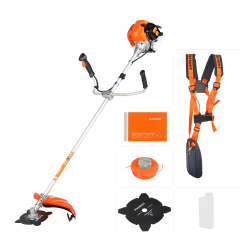 Двигатель в сборе с рукояткой управления; Трансмиссионный узел в сборе; Рукоятка (левая часть); Ранцевый ремень; Защитный кожух с крепежной планкой; Триммерная катушка; Нож 4х-лопастной металлический; Комплект для установки триммерного ножа; Канистра для приготовления топливной смеси; Соединительное звено рукояток; Набор крепежа и инструментов для сборки; Инструкция по эксплуатации;