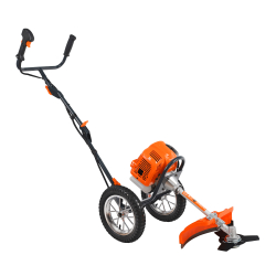 Триммер колесный; Колеса: 2 шт.; Трансмиссонный узел (вал) в сборе; Защитный кожух с крепежной планкой; Триммерная катушка; 3-х лопастной металлический нож; Комплект для установки триммерного ножа; Канистра для приготовления топливной смеси; Набор крепежа и инструментов для сборки и обслуживания; Запасная леска; Инструкция по эксплуатации;